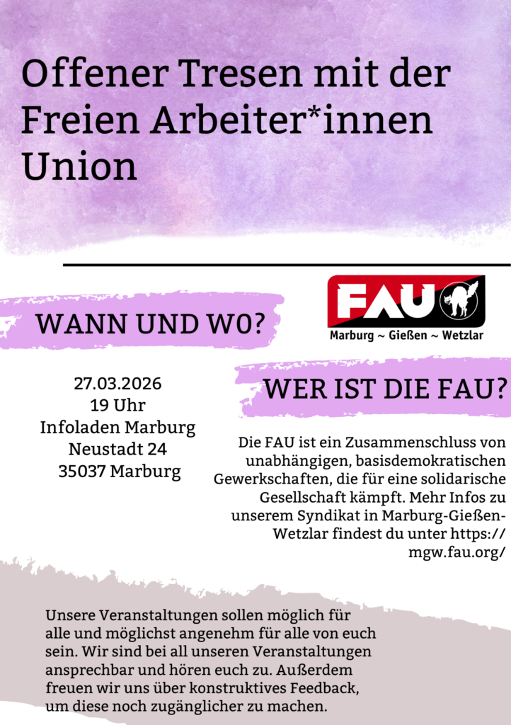 You’re warmly invited to the FAU (Freie Arbeiter*innen Union) open Sit In on Friday at 7 p.m. at the Infoladen in Marburg. Feel free to stop by after work, school, or care work for a drink and some music. Come by to relax, vent about work, the state of the world in general or if you have questions about our work and how we’re organizing for a different kind of society.