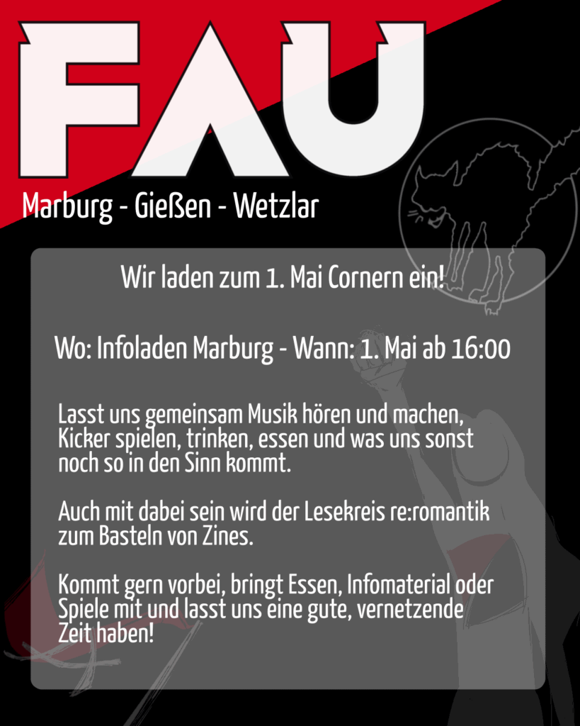 Waren anarchistische Gesellschaften möglich und lebensfähig? Welche Wege zeigt uns die Geschichte für eine klassenlose, föderalistische und solidarische Gesellschaft? Über die Rolle der anarcho-syndikalistischen Gewerkschaften, der politischen Verwaltung und der kulturellen Vorbedingungen spricht der Historiker Helge Döhring vom Institut für Syndikalismusforschung (SyFo), www.syfo.info mit uns. Und zwar am 30.05. um 19 Uhr in der Baari Bar in Marburg (Afföllerwiesen 3A, 35039 Marburg). Die Räumlichkeiten sind nur bedingt barrierefrei, solltet ihr kommen wollen und habt noch Fragen dazu, schreibt uns gerne eine Mail an fauli@fau.org.