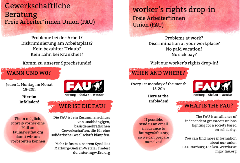 We offer a union consultation hour every first Monday of the month at the Anarchistischer Infoladen Marburg (Neustadt 24) from 6–8 p.m.